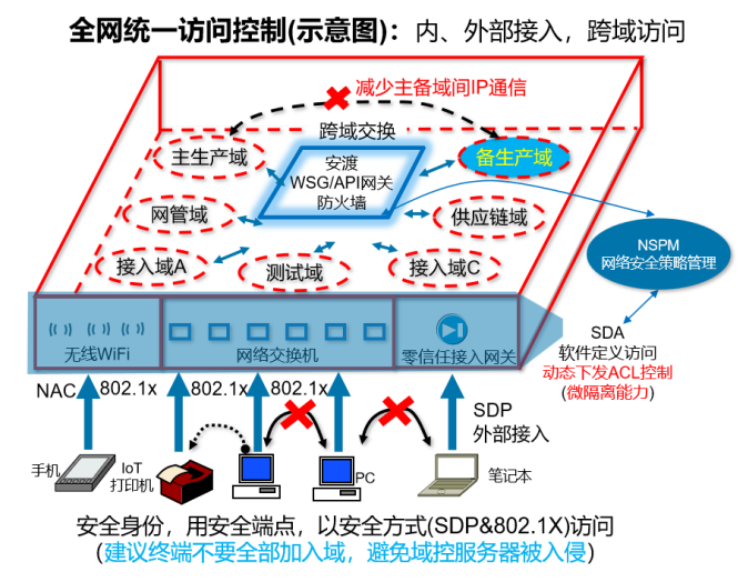 通过将数据中心进行分域,实现各项业务的隔离和安全等级的区分,阻止勒索病毒在数据中心横向移动。通过建立单独的备份域,确保在极端情况下,生产系统可以快速恢复,保障核心业务不中断。通过防火墙/安渡/WSG/API网关来收敛和最小化跨域的网络访问关系,进一步减少勒索攻击跨域传播和扩散的可能性。